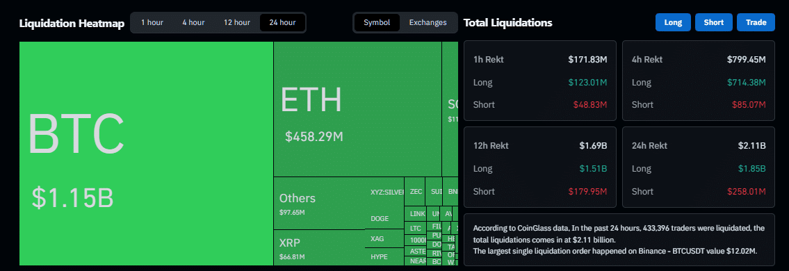 Conform datelor CoinGlass, 433.413 de traderi au fost lichidați în toate criptomonedele în ultimele 24 de ore, ștergând din poziții în valoare de 2,11 miliarde de dolari. Bitcoinul singur a reprezentat 1,15 miliarde de dolari în lichidări forțate la momentul scrierii,