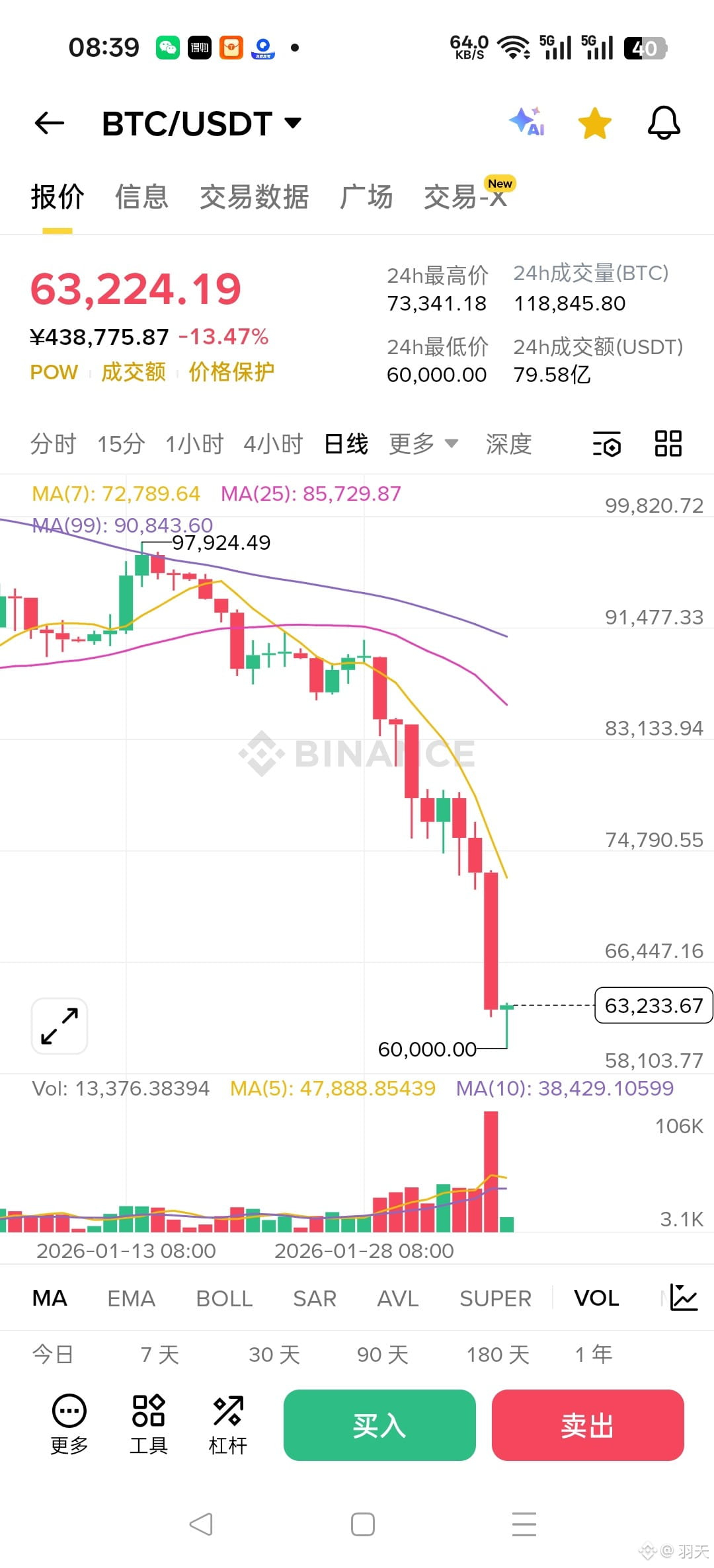 今天加密圈直接大崩盘,血洗全场!市场恐慌指数直接干到12,妥妥的极度恐慌极点,比特币也跟着崩,一天跌超12%,最低砸到6.3万美元,24小时四十多万人直接爆仓,亏进去的钱加起来有144亿,那些加杠杆的账户全被强平,哭都没地儿哭。不光比特币跌惨,币安的BNB更狠,700美元的关口直接干穿,现在就640多美元晃悠,全靠平台那10亿SAFU基金硬撑着,看着就悬。
