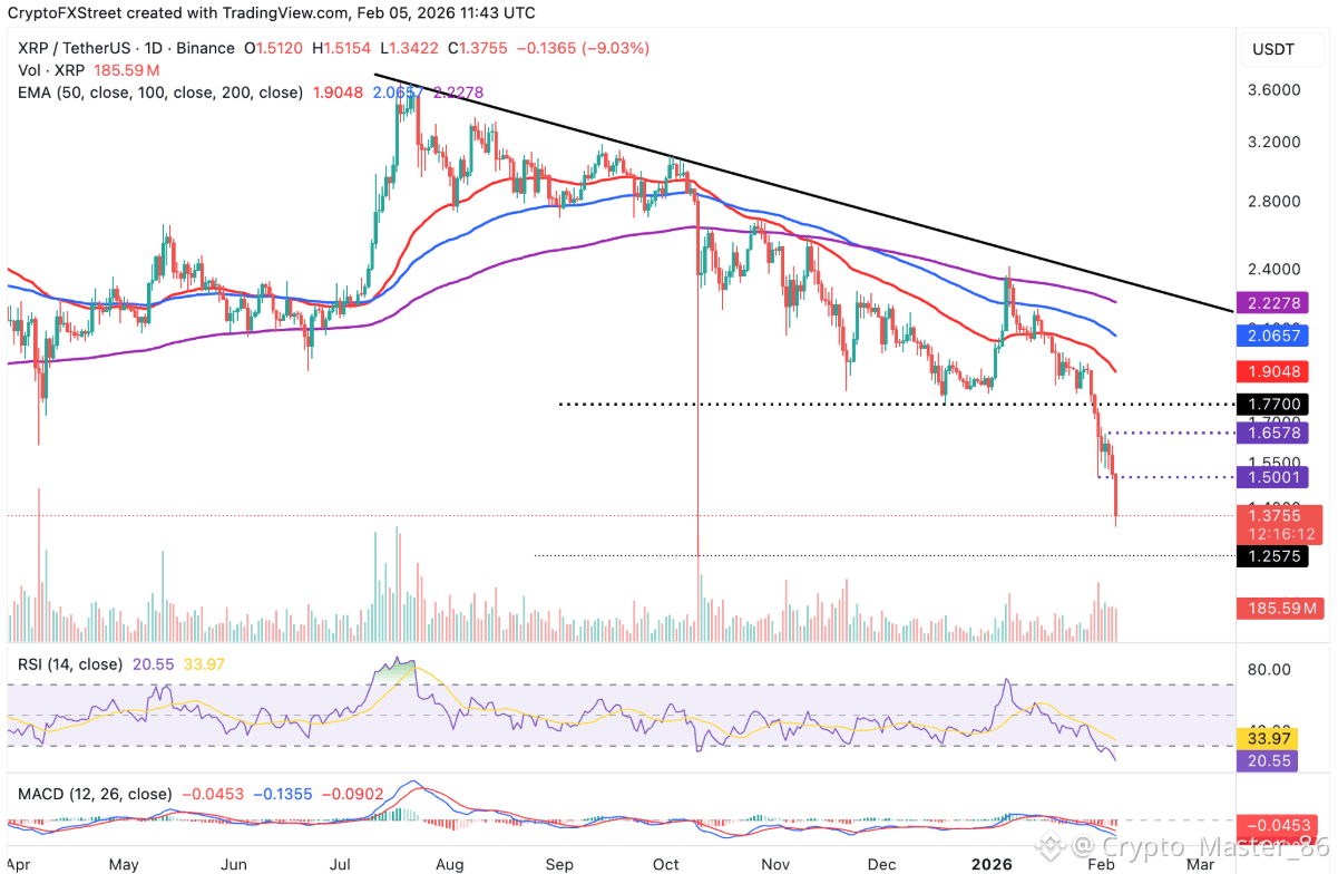 Ripple (XRP) đang chìm sâu trong áp lực bán, trượt về vùng 1,37 USD tại thời điểm ghi nhận vào thứ Sáu, qua đó phản ánh rõ nét tâm lý “né rủi ro” đang bao trùm thị trường tiền điện tử. Token chuyên dùng cho hoạt động chuyển tiền này đã mất gần 10% giá trị chỉ trong một ngày, khi thị trường rung lắc dữ dội, nhà đầu tư nhỏ lẻ đồng loạt thu hẹp vị thế, còn dòng tiền từ các tổ chức cũng cho thấy dấu hiệu chững lại.