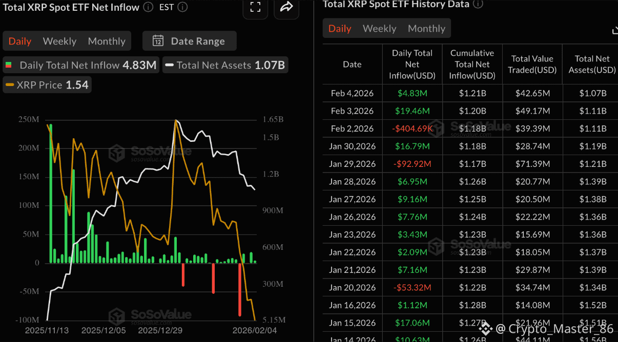 Ở chiều ngược lại, nhu cầu đối với các quỹ XRP ETF giao ngay cũng suy yếu trong phiên thứ Tư, khi dòng vốn vào chỉ đạt gần 5 triệu USD. Dù con số này khá khiêm tốn, đây vẫn là ngày thứ hai liên tiếp ghi nhận dòng tiền dương, sau mức gần 19 triệu USD vào thứ Ba. Tính đến hiện tại, tổng dòng vốn tích lũy đã đạt 1,21 tỷ USD, trong khi tổng tài sản quản lý (AUM) ở mức khoảng 1,07 tỷ USD.