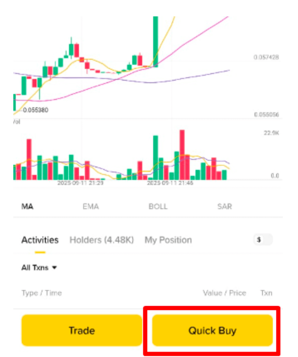 O caracteristică pe care am observat-o cu adevărat se numește Cumpărare rapidă. Este concepută pentru a economisi timp. În loc să selectezi manual totul, Cumpărarea rapidă alege automat tokenul de rețea corect și o sumă sugerată pe baza soldului tău din portofel.