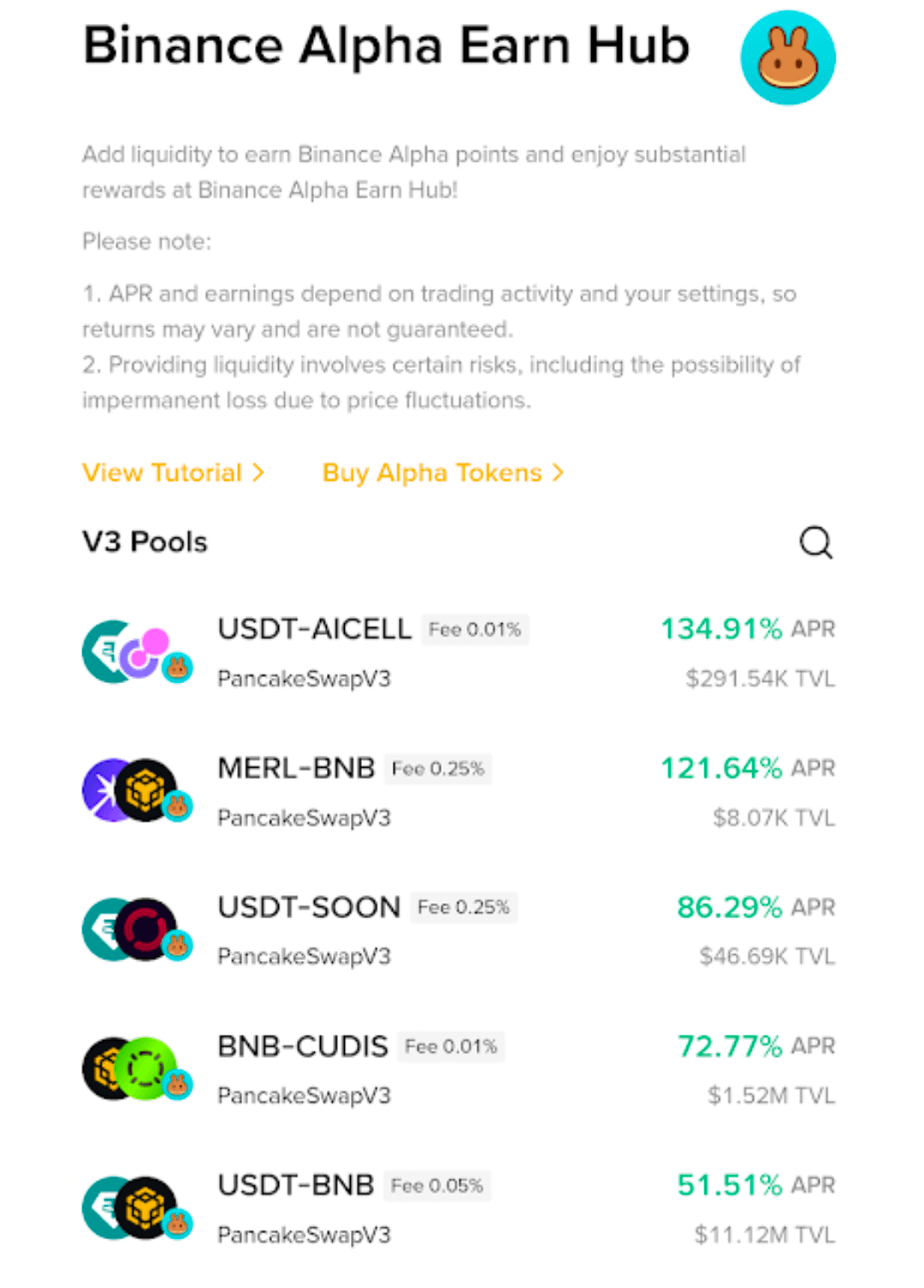 În timp ce citeam mai mult, am descoperit Alpha Earn Hub. Această parte permite utilizatorilor să ofere lichiditate la PancakeSwap V3 direct din portofelul Binance. Nu trebuie să părăsești aplicația sau să conectezi instrumente suplimentare.