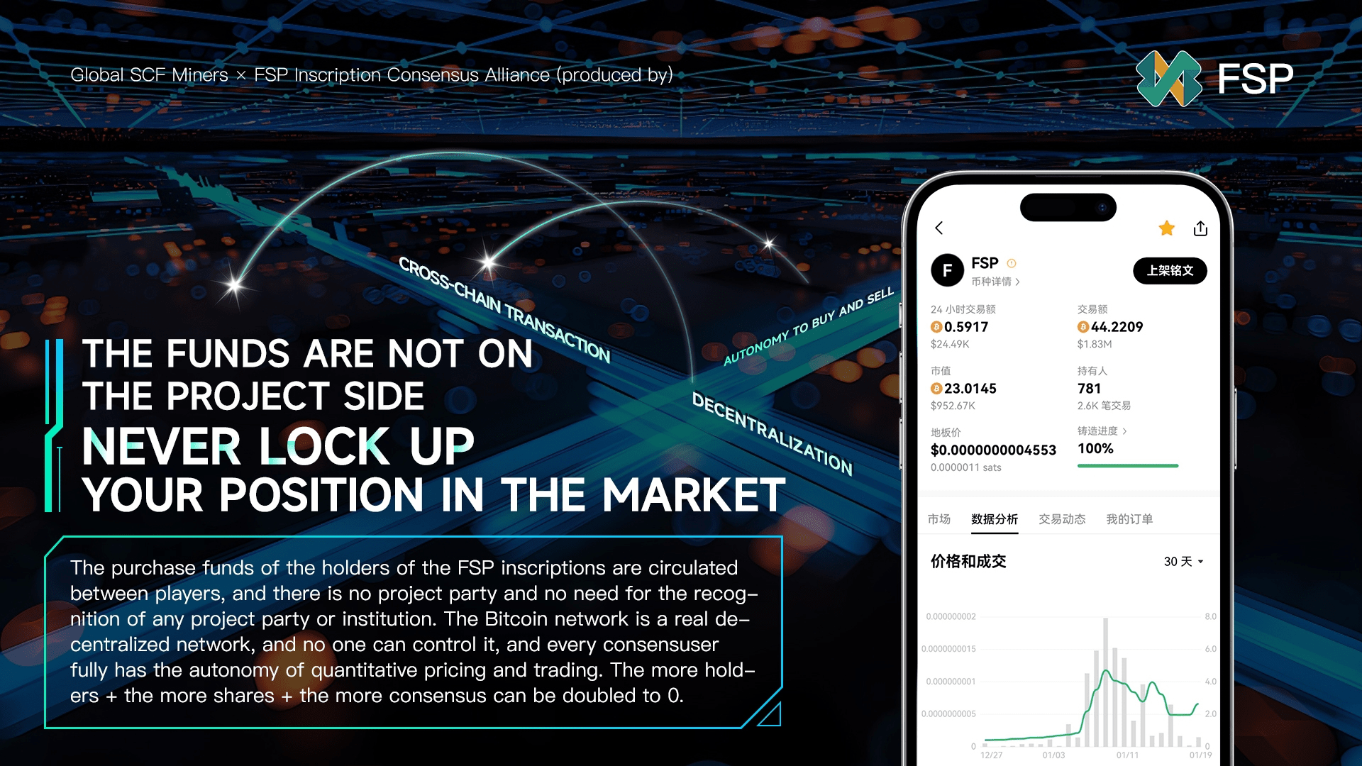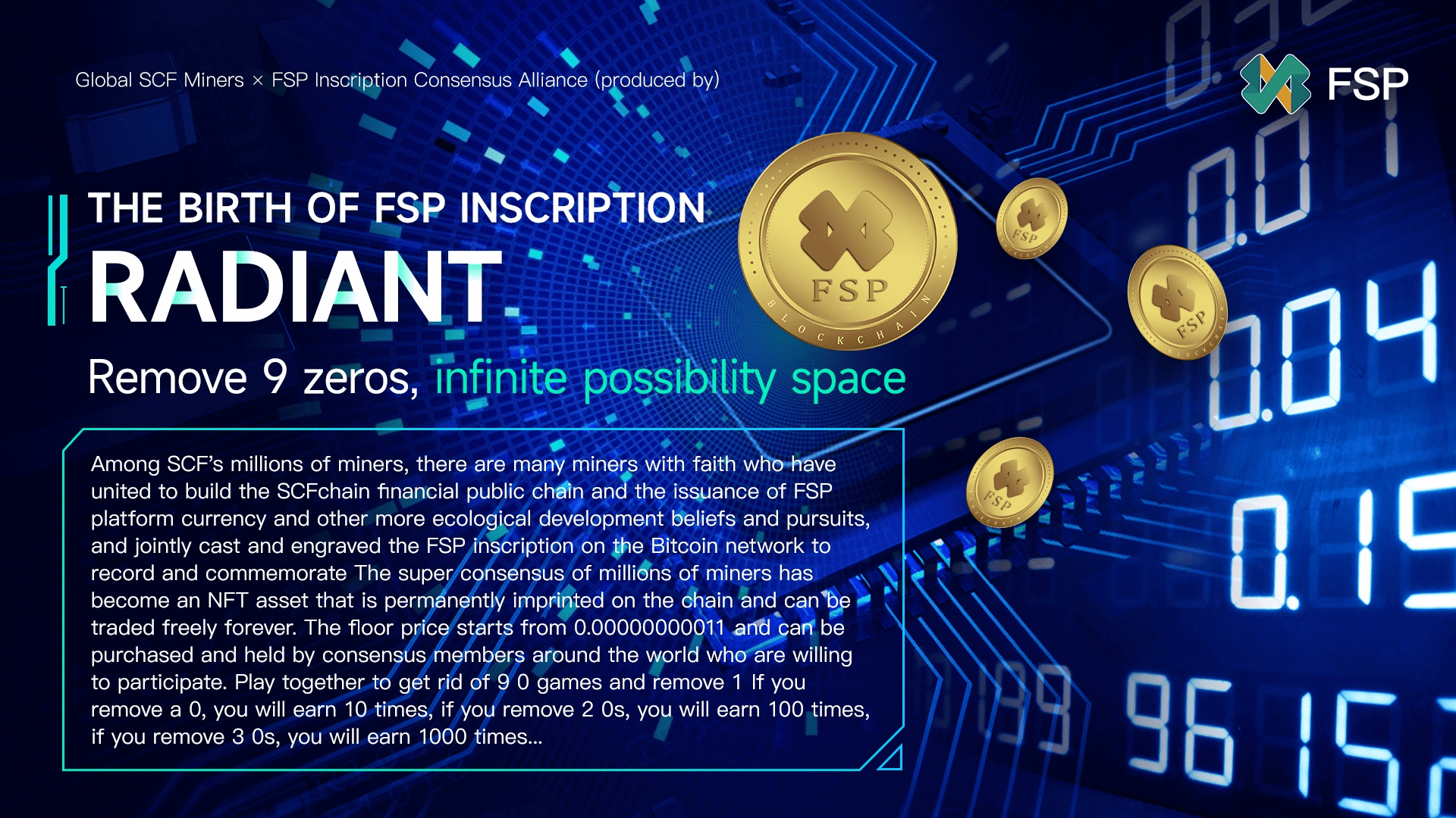 Milioane de mineri SCF și mineri cu credință s-au unit pentru a construi lanțul public financiar SCFchain și emisiunea de monedă a platformei FSP și alte credințe și activități mai ecologice de dezvoltare, și au turnat și gravat în comun inscripția FSP pe rețeaua Bitcoin pentru a înregistra și comemora milioane Super consensul de Minerii a devenit un activ NFT care este imprimat permanent pe lanț și poate fi tranzacționat pentru totdeauna. Prețul minim începe de la 0,00000000011 și poate fi achiziționat și deținut de membrii consensuți din întreaga lume, care sunt dispuși să participe 9 0 jocuri și eliminați 1 0. Câștigați de 10 ori, eliminați 2 zerouri și câștigați de 100 de ori, eliminați 3 zerouri și câștigați de 1000 de ori...