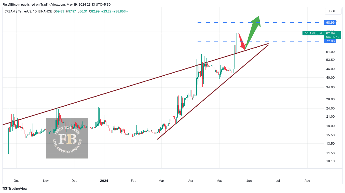 CREAM/USDT a ieșit din triunghiul său ascendent, indicând o tendință de urcare. Urmăriți potențiale ținte în jur de 100 USD.