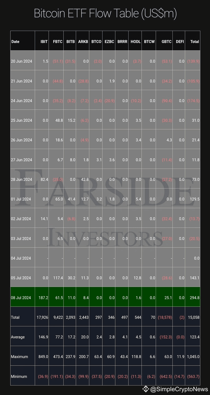 🔥 8 июля американские BTC ETF собрали $295 млн. BlackRock зафиксировал приток в $182 млн, что стало крупнейшим значением с 7 июня