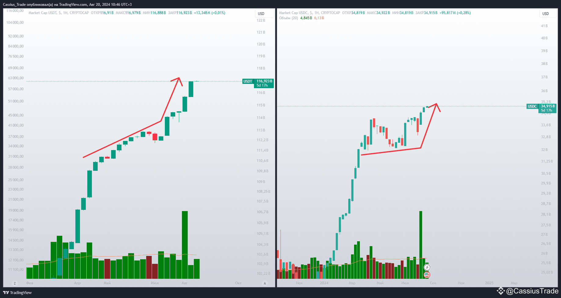 2️⃣ Печать самых популярных на крипторынке стейблкоинов #USDT и #USDC сильно увеличилась за последний месяц после несколько месяцев стагнации на +- одинаковых уровнях