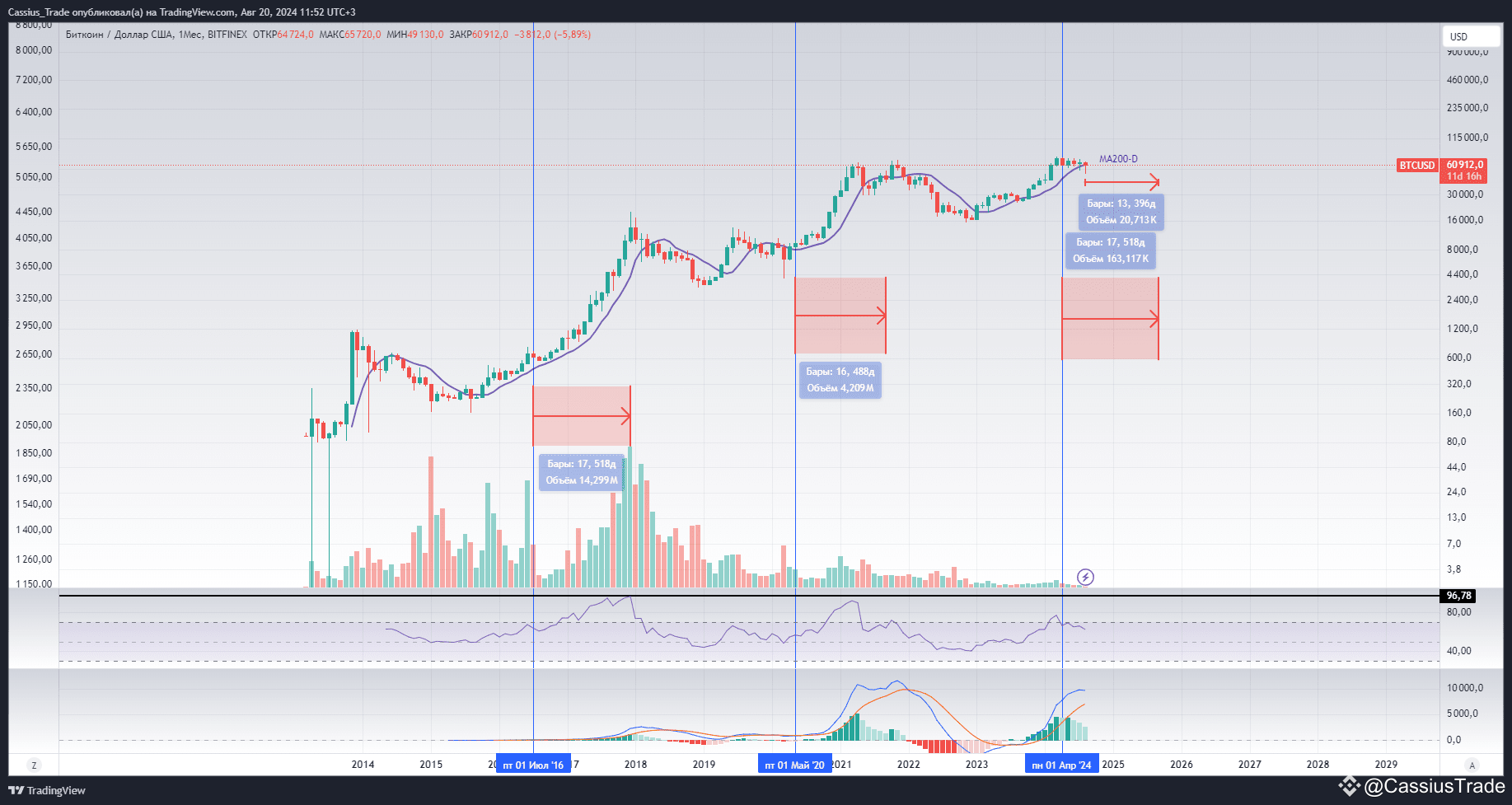 Причем в текущем цикле каждая месячная свеча закрывается строго выше долгосрочной скользящей, что указывает на продолжение нахождения в бычьем тренде. Cхожесть динамики циклов видна не вооруженным глазом.
