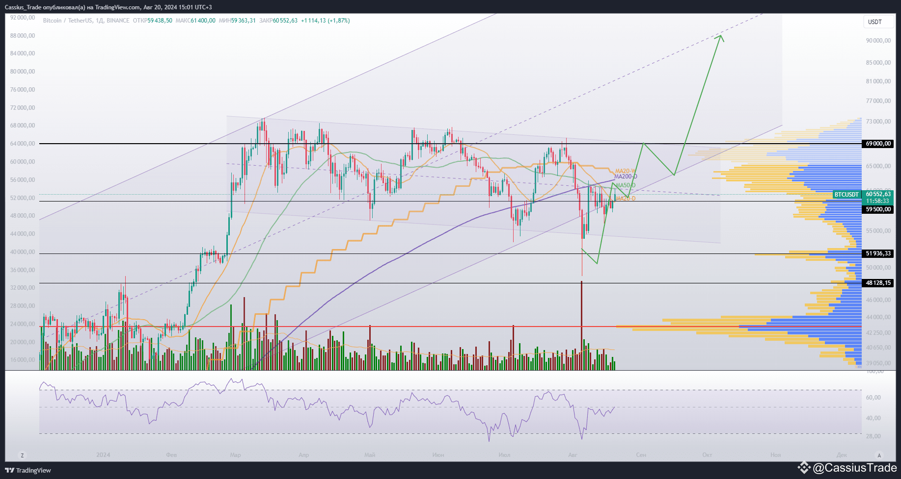 Однако, цена очень активно принимает попытки вернутся выше долгосрочных скользящих средних проходящих в районе 61500-63500$.