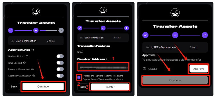Затем: 1. Введите адрес любого кошелька EVM 2. Отметьте кнопку 3. Нажмите «Перевести».