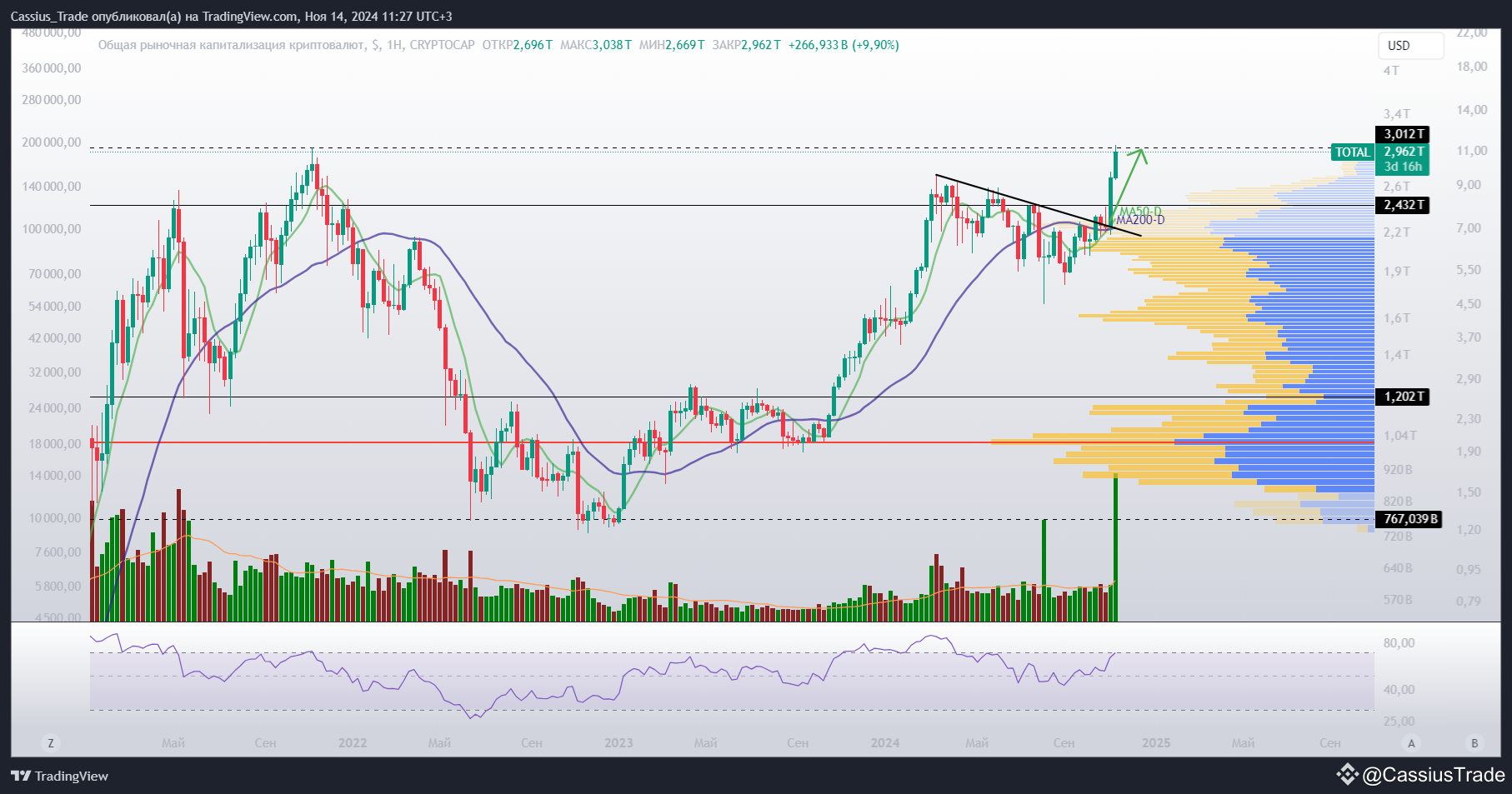 1️⃣ Капитализация всего рынка криптовалют двигается по аналогичному паттерну как у Биткоина. Мы еще только сломали нисходящий тренд.