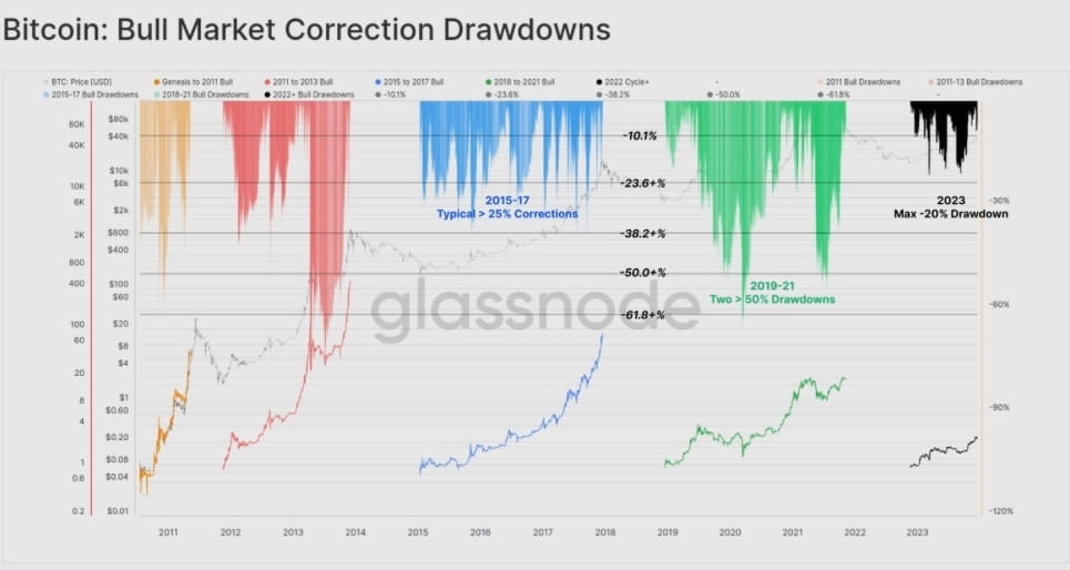 Исторически сложилось так, что периоды восстановления после медвежьего рынка и начало бычьего рынка для BTC регулярно видят откат не менее -25% от локального максимума, во многих случаях даже -50%. (вспомним 2021 год)