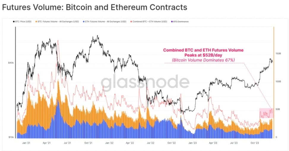 Общий ежедневный объем составлял $52 млрд в день. На биткоин-контракты пришлось 67% объема торгов по сравнению с 33%, связанными с контрактами на эфир.