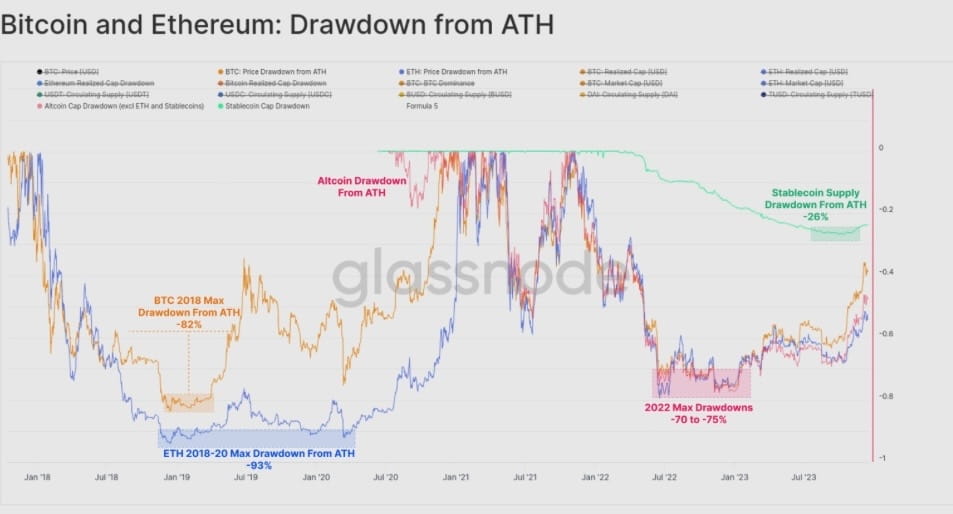 Медвежий рынок 2022 года был немного менее жестоким, чем медвежка 2018-20 годов. Основные криптовалюты в настоящее время отстают от своих ATH на -40% (BTC), -55% (ETH)