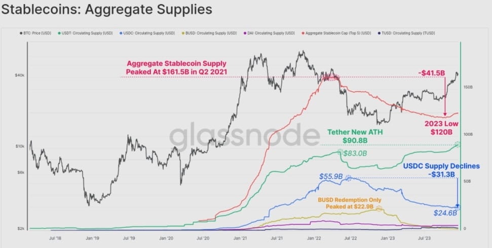 Октябрь развернул ситуацию на 180 градусов, когда MCap стейблкоинов достиг дна в 120 млрд, а после предложение начало расти по 3% в месяц.