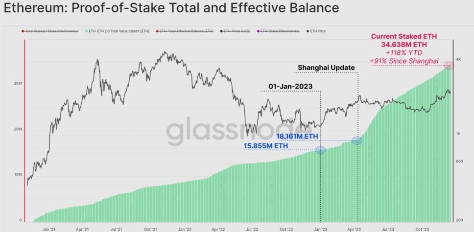 Ключевой областью роста для Ethereum был общий объем ETH, заблокированный через Proof-of-Stake.