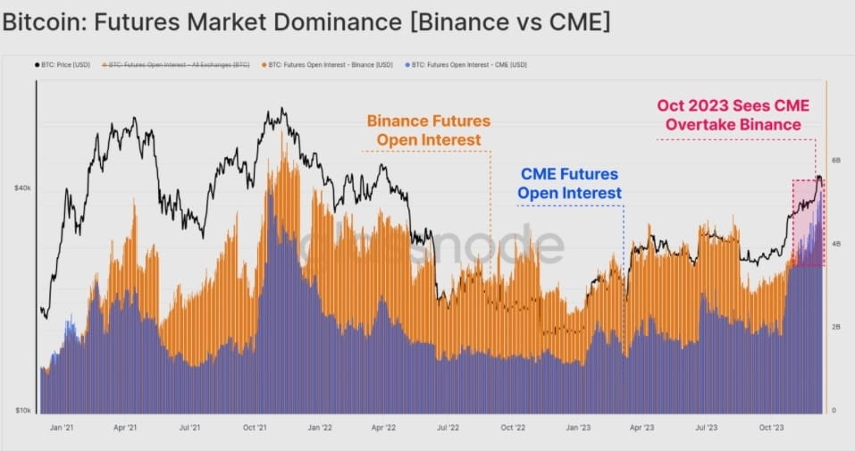 Открытый интерес на регулируемой бирже CME впервые в истории обгонял сумму открытых позиций на Binance. Октябрь и тут сыграл главную роль, намекая на приток институционального капитала.