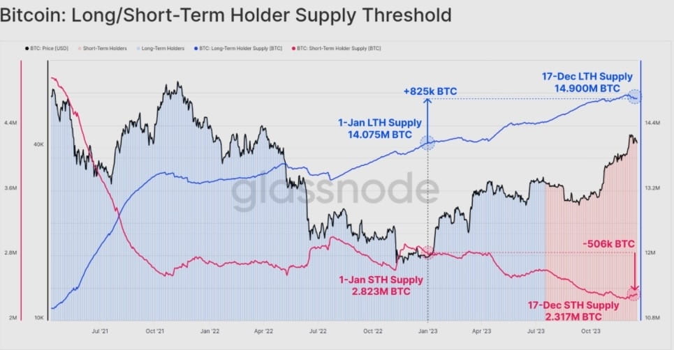 Львиная доля BTC удерживается долгосрочными держателями, и большинство инвесторов в настоящее время в прибыли, так как спотовый ETF на Биткоин почти наверняка одобрят в январе 2024 года, вдобавок халвинг не за горами, в апреле, поэтому Криптосообщество готово к новому, захватывающему году