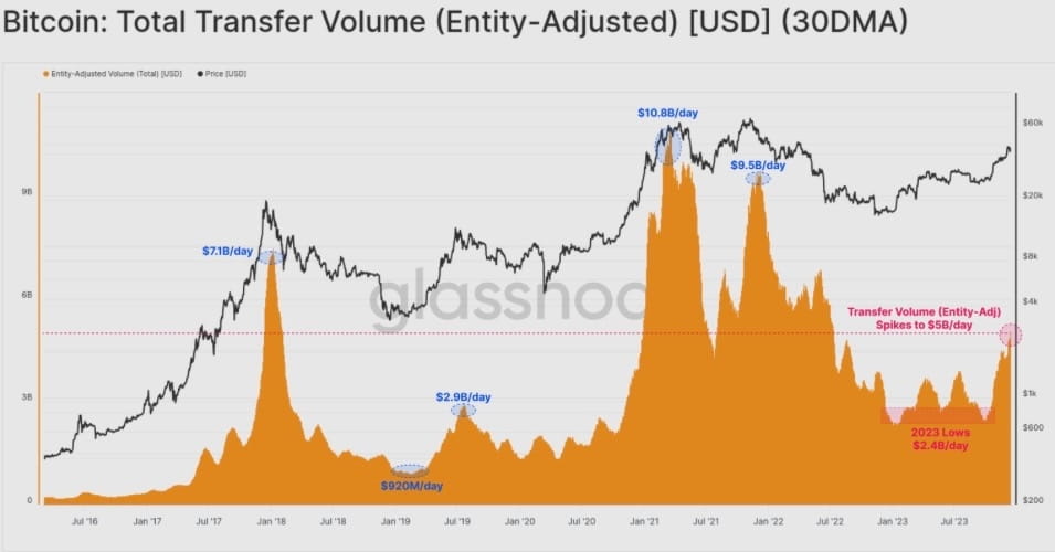 Ралли увеличило объемы переводов в сети Bitcoin вдвое с $2,4 млрд в день до более чем $5 млрд в день, что является самым высоким уровнем с июня 2022 года.