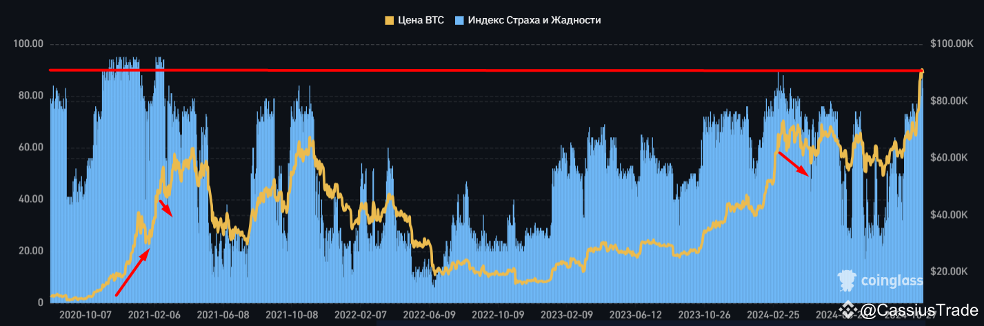 1️⃣ Индекс страха и жадности достиг отметки 83 пунктов, а в моменте достигал даже отметки 90