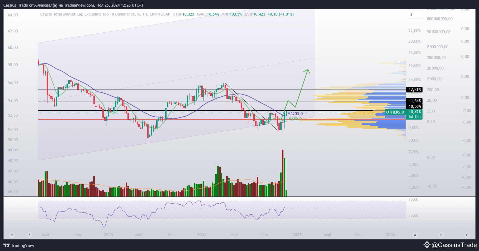 Доминация альтов успешно пробила долгосрочную скользящую MA200d и уперлась в ключевое сопротивление 10,56%. Учитывая какой заходит объем - пробой ключевого уровня произойдет очень скоро. А значит альты продолжат свой рост.