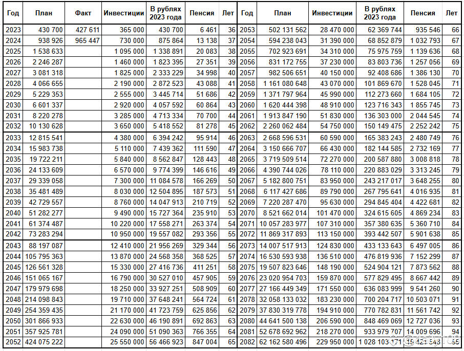 При таком раскладе можно выйти на пенсию в 55 лет, прекратить инвестиции и получать 300 000 на процентах ежемесячно (с покупательской способностью на момент 2023 года). В отдельном столбце для лучшего понимания космических цифр учел рубль из 2023го.