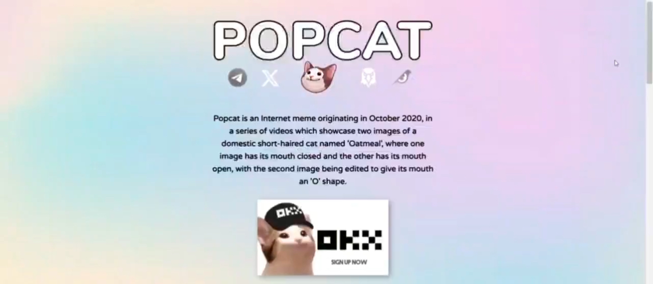 $POPCAT — интернет-мем, возникший в октябре 2020 года. Он представляет собой серию видеороликов с двумя изображениями домашней короткошерстной кошки по кличке «Овсянка». На одном изображении рот кошки закрыт, а на втором — рот отредактирован в форме буквы «О», создавая впечатление, что он открыт.