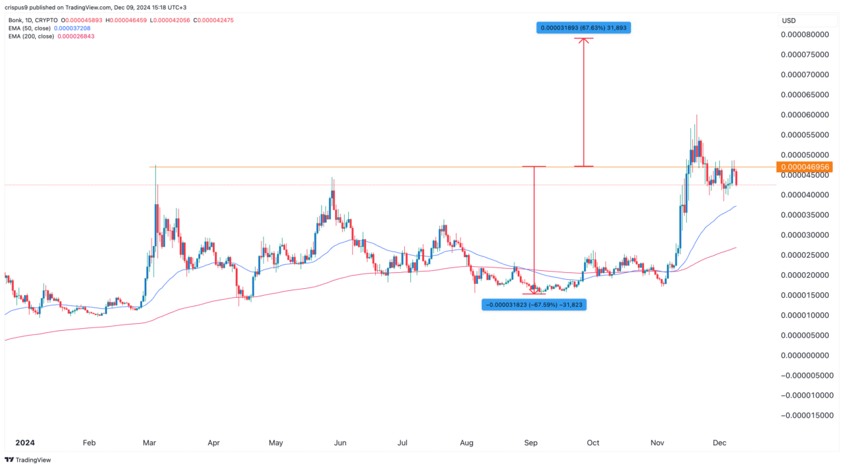 Bonk, OG мем-койн Solana, это еще одна лучшая криптовалюта для покупки и удержания в 2025 году. Хотя многие мем-койны приходят и уходят, он остается в индустрии уже два года и недавно достиг своего исторического максимума.