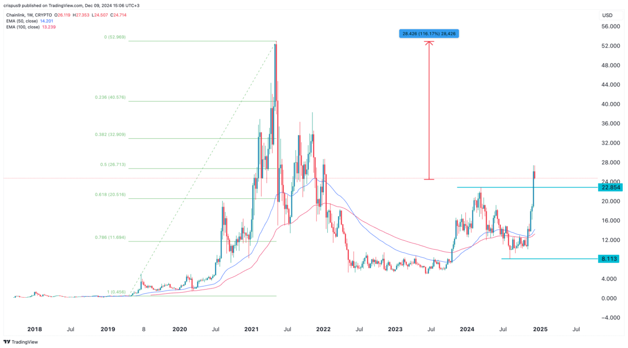 Chainlink - одна из лучших криптовалют для покупки и удержания в 2025 году. На недельном графике она преодолела ключевую точку сопротивления на уровне $22.85, своем самом высоком уровне 11 марта. Она также протестировала уровень 50% по Фибоначчи и поддерживается 50-недельной скользящей средней.