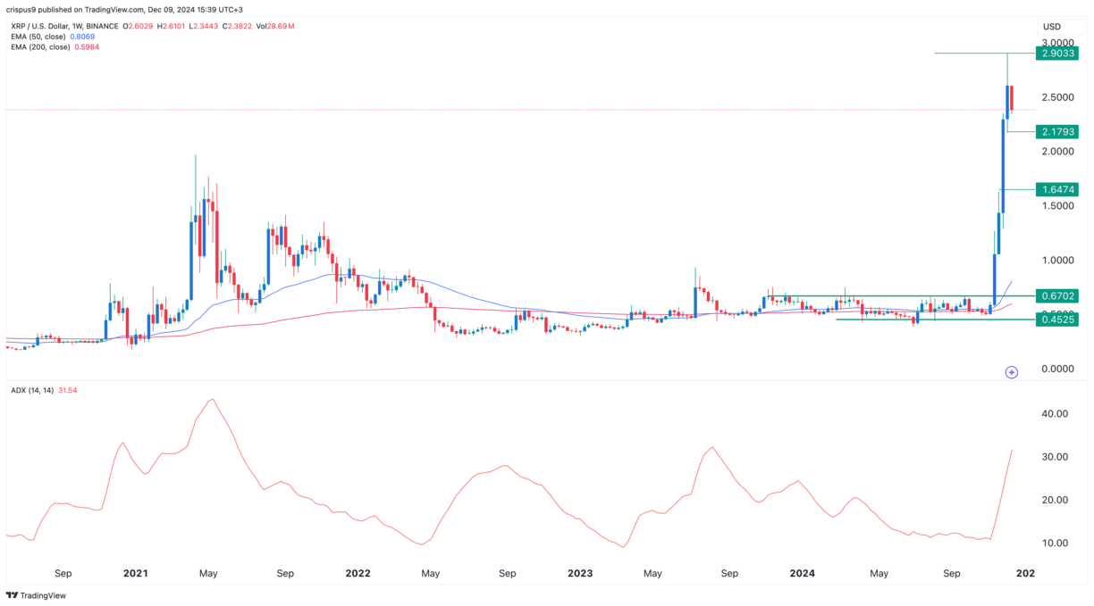 Технически цена XRP имеет импульс, оставаясь значительно выше всех своих скользящих средних. Средний направленный индекс (ADX) поднялся до 31, что является знаком наличия импульса. Этот тренд может привести к росту до исторического максимума в $3.30, за которым последуют дальнейшие gains, как мы писали ранее сегодня.