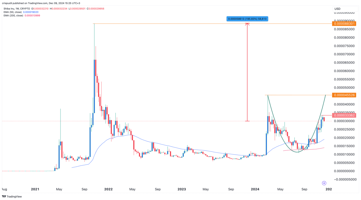 Монета также формирует паттерн «чашка с ручкой», верхняя сторона которого находится на уровне $0.00004552, максимуме текущего года. Этот паттерн означает, что цена SHIB имеет потенциал для дальнейшего роста в 2025 году, с возможностью достижения исторического максимума в $0.0000883.