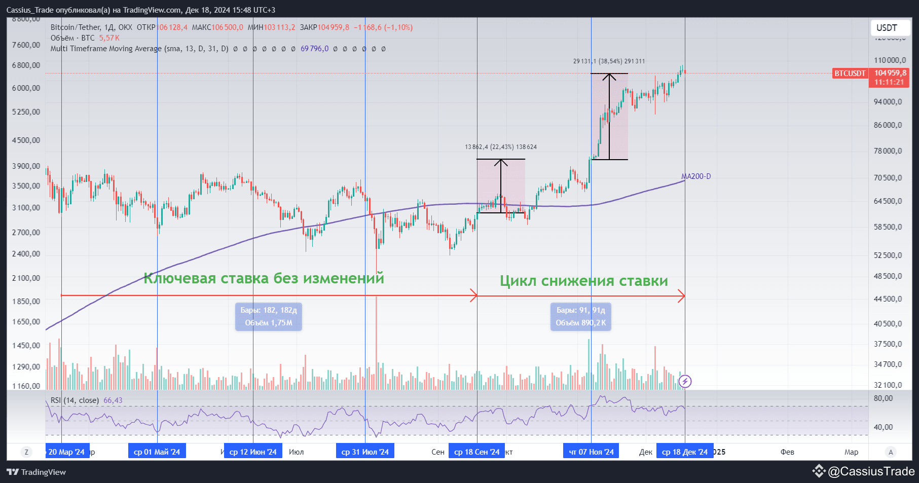 Как можете видеть, в период когда ключевая ставка держалась без изменений $BTC торговался в рамках боковика.