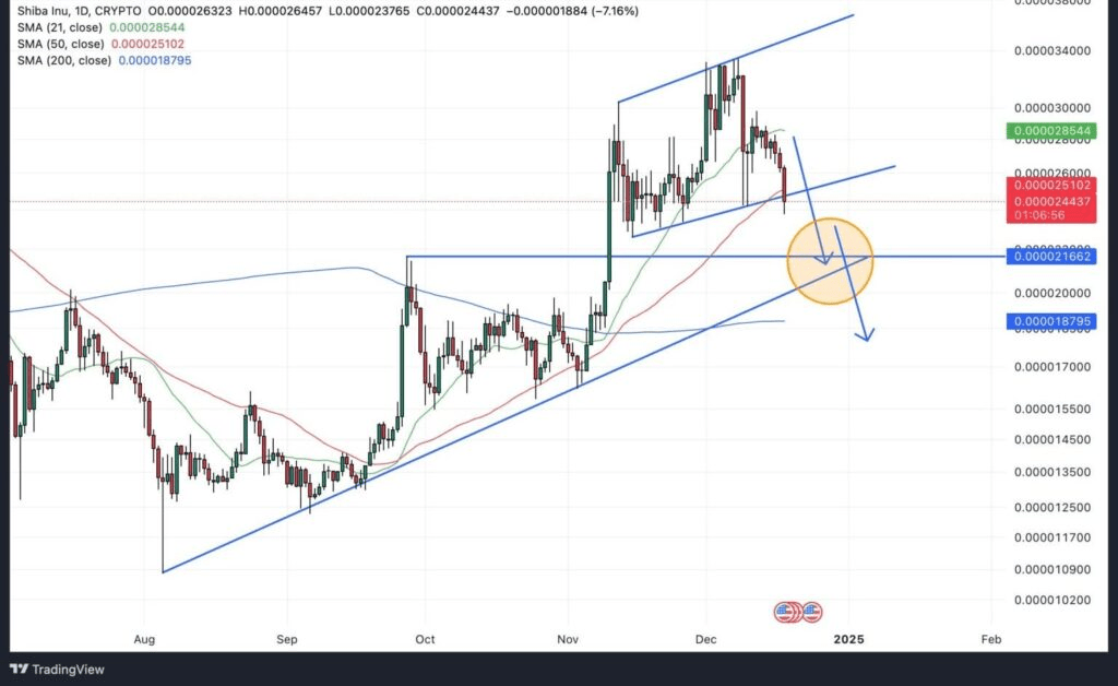 Тем не менее, долгосрочный бычий тренд, начавшийся с минимума лета 2024 года, для SHIB остается неизменным. Однако падение ниже этой ключевой линии тренда, вероятно, приведет к дальнейшему медвежьему периоду.