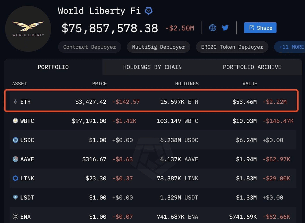На фоне изменений на криптовалютном рынке настоящий ажиотаж вызвала новость о семье Трампа и Ethereum. Согласно авторитетным данным мониторинга, команда WLFI, причастная к семье Трампа, продемонстрировала потрясающее мастерство в удержании позиций в Ethereum. В настоящее время они держат в своих руках 15 597 ETH. Согласно текущей рыночной цене, их общая стоимость достигает 53,46 миллиона долларов США, что бесспорно занимает лидирующую позицию среди активов.