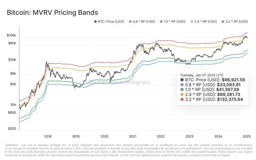 Если $100 000 (желтая линия) будет пробита, следующая зона сопротивления на этом индикаторе будет выше $132 000 (3,2*RP). Во время двух последних бычьих периодов (2017 и 2021 годы) Биткойн даже значительно превысил этот внутрисетевой уровень…