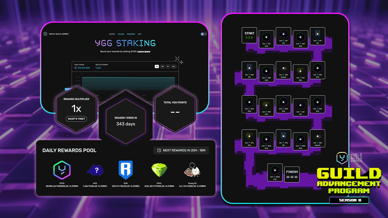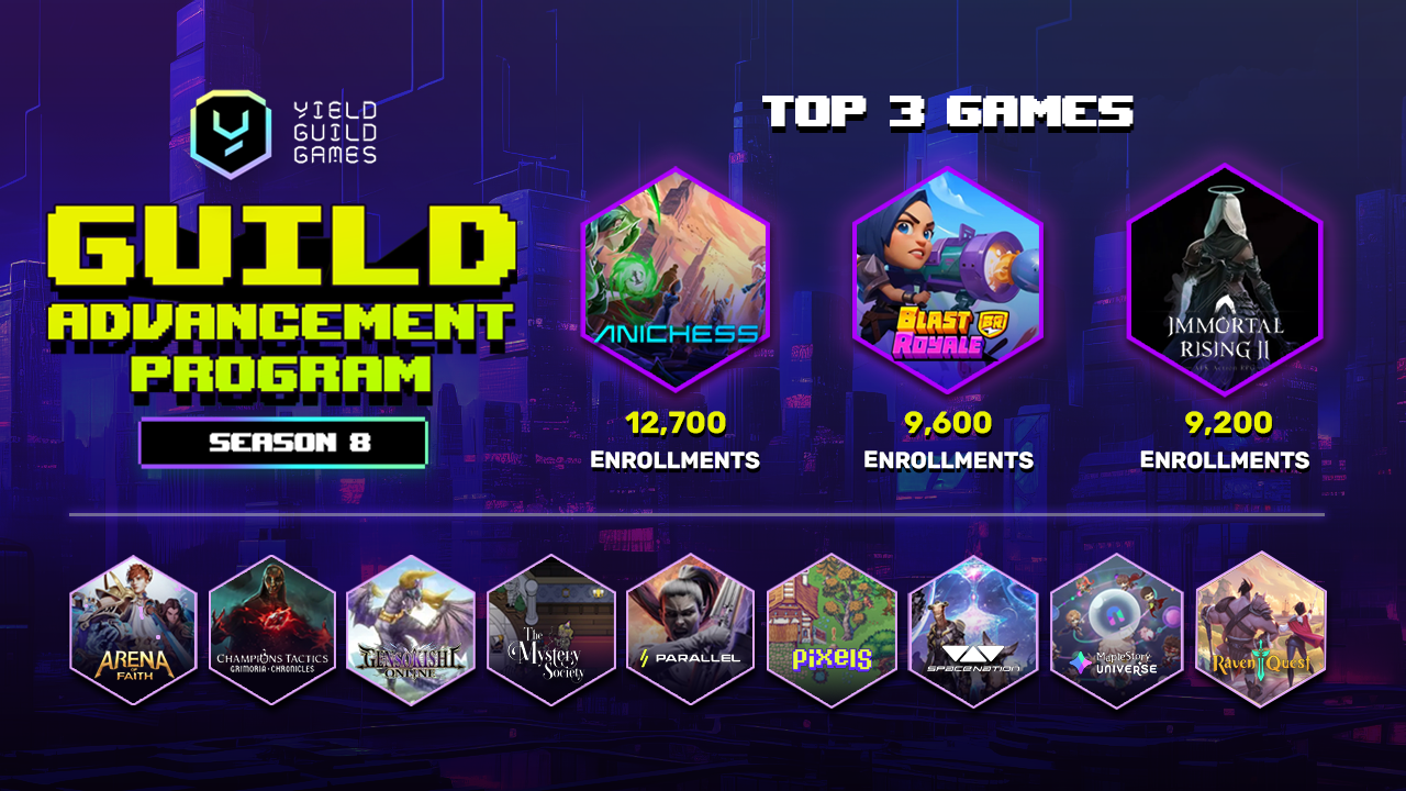 С момента запуска платформы на YGG Play Summit, с первой волной гильдий на блокчейне, программа повышения гильдий (GAP) установила новый рекорд в восьмом сезоне. Теперь участники могут выполнять задания от имени гильдий на блокчейне, одновременно конкурируя на таблице гильдий для получения большего количества наград.