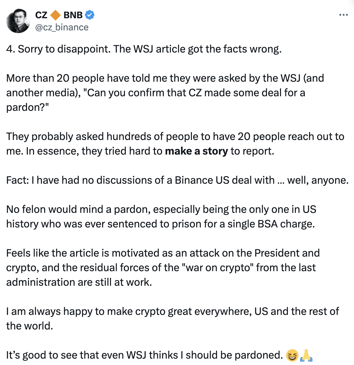 Согласно тем же источникам, упомянутым ранее, WSJ раскрыл еще одну важную проблему: CZ выступает за помилование.