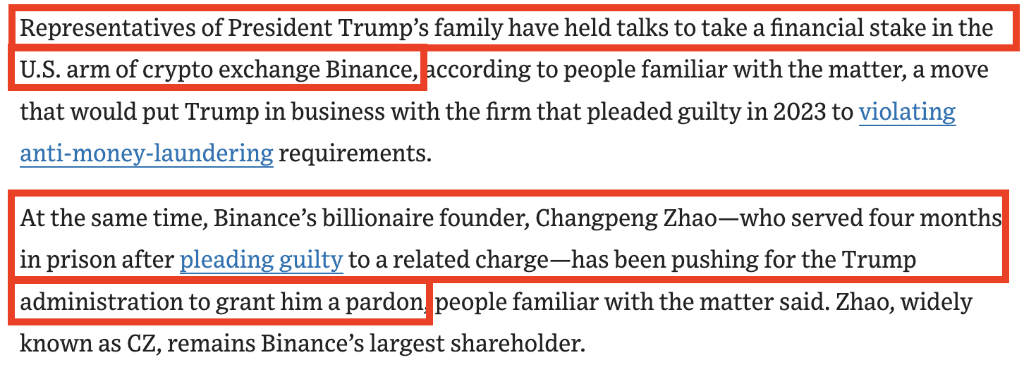 Последние данные The Wall Street Journal указывают на то, что семья Трампа вела переговоры с Binance, крупнейшей криптобиржей в мире, возможно, надеясь на долю в американском подразделении биржи.
