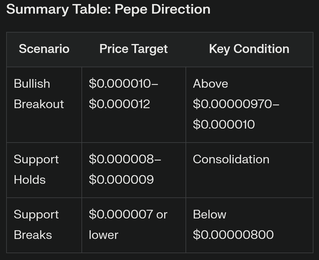 Цели: Если импульс продолжится, PEPE может протестировать уровень $0.00001000–$0.00001150, и некоторые аналитики прогнозируют краткосрочный скачок до $0.00001163 или выше.