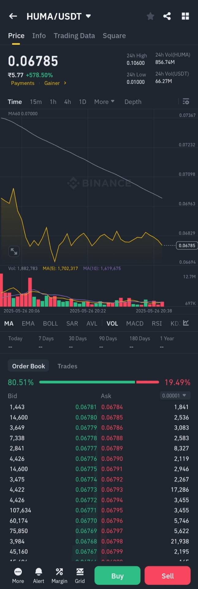 По состоянию на 27 мая 2025 года Huma Finance ($HUMA ) торгуется по цене примерно $0.068, что отражает значительное снижение на 39% от его исторического максимума $0.1156, достигнутого ранее в тот же день. Эта волатильность следует за недавним листингом на Binance Alpha и значительным событием аирдропа. Несмотря на резкое падение, 24-часовой объем торгов HUMA остается высоким, превышая $235 миллионов, что указывает на сильный интерес со стороны рынка.