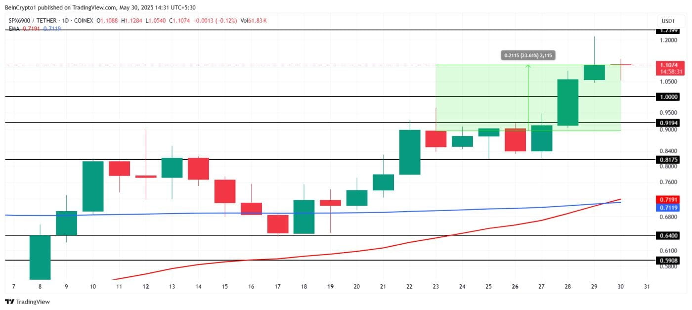 Токены #SPX являются одними из лучших мем- и альтернативных монет по производительности, увеличившись на 23.6% за последнюю неделю. Эта восходящая тенденция подтолкнула цену выше 1.00 доллара, и в настоящее время SPX торгуется по 1.10 доллара, что демонстрирует сильный импульс на волатильном рынке.
