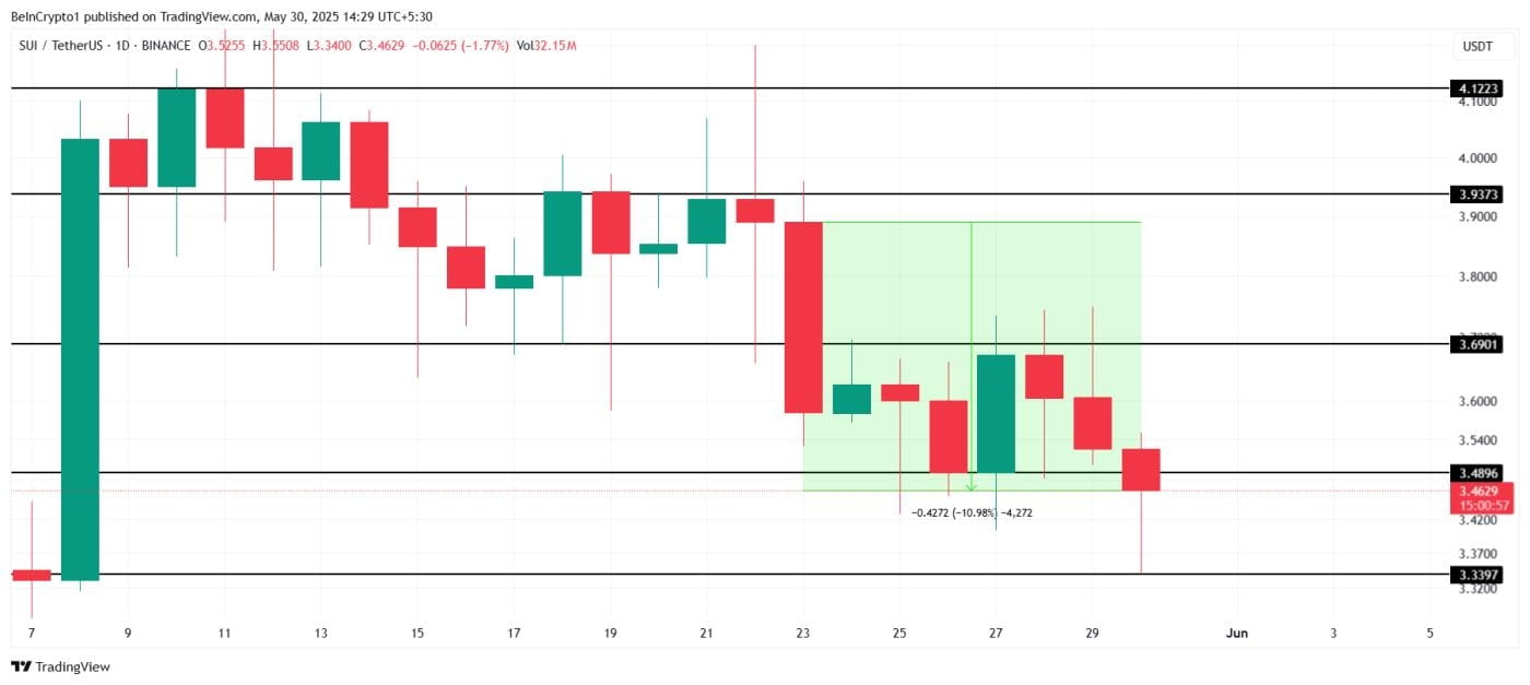 Снижение составило примерно 11% за последние 24 часа, поскольку она торгуется по цене 3.46 доллара. Падение альтернативной монеты соответствует тенденциям более широкого рынка, но может усугубиться в эти выходные из-за внутренних факторов, связанных с SUI.