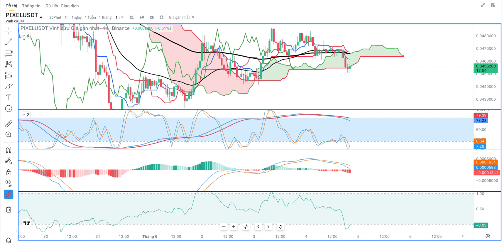 • PIXEL находится в стадии консолидации, заблокирована сверху красным облаком и длинными EMA.