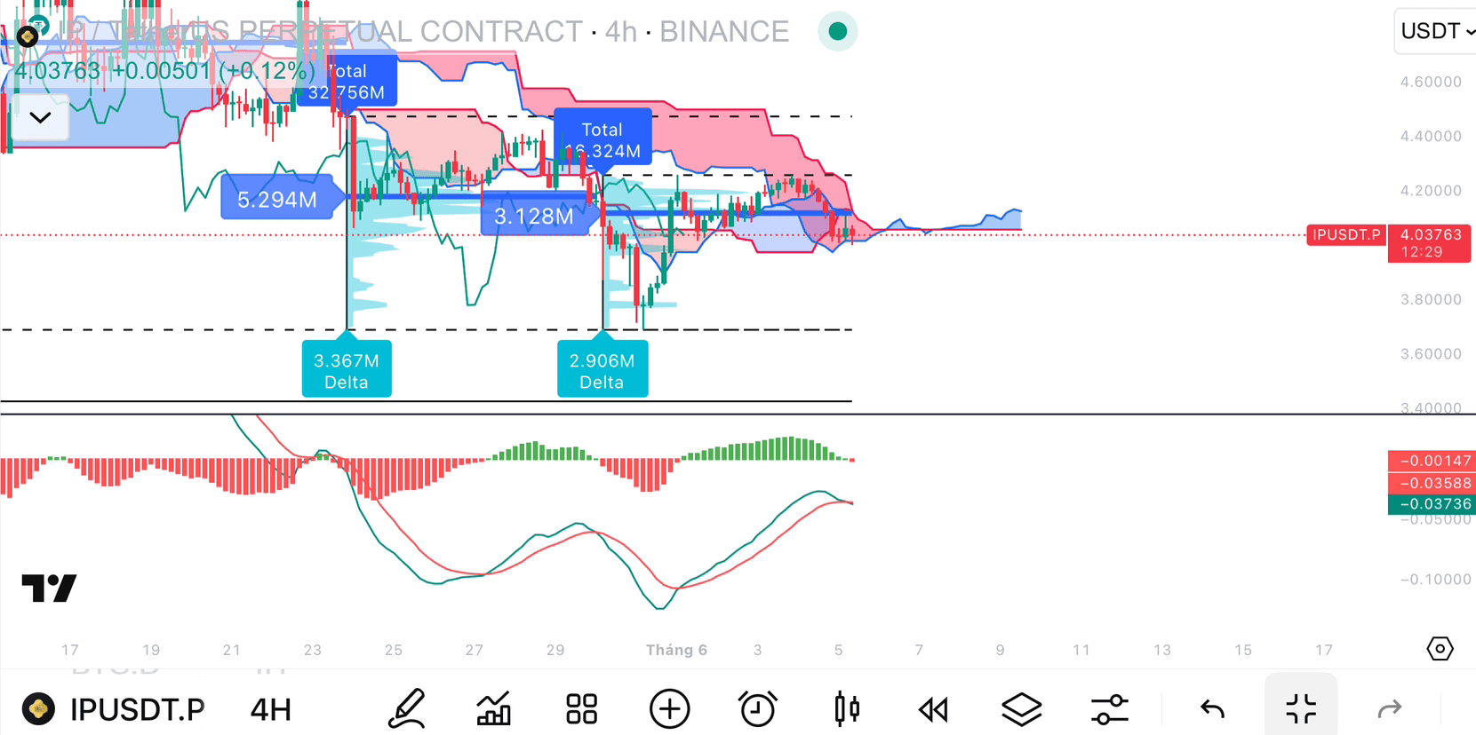 • Текущая цена находится рядом с областью накопления низкого объема, если пробьет, может быстро упасть к сильной поддержке около 3.70–3.80.