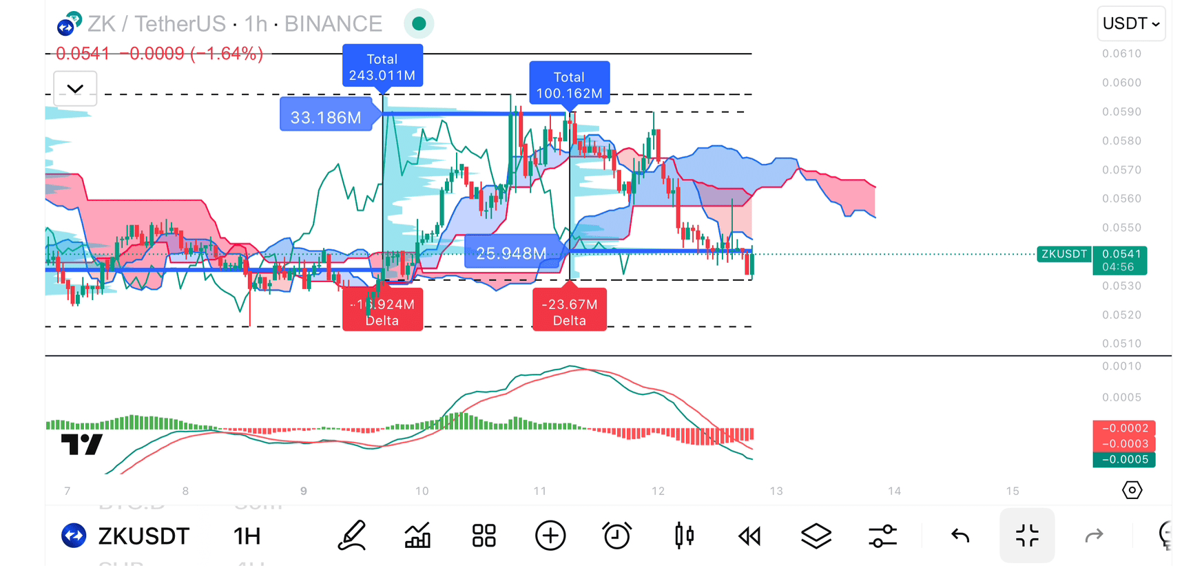 ZKUSDT находится в опасной зоне после того, как не смог удержаться над облаком Kumo и объёмом накопления. Большое давление продаж Delta, MACD и Ишимоку подтверждают краткосрочный медвежий тренд. Шорт в районе 0.0548 – 0.0555 является трендовой сделкой, с низким риском и высоким потенциалом прибыли, если цена пробьет минимум 0.053.