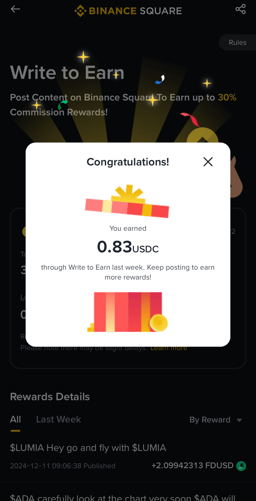 Я недавно начал исследовать программу «Пиши и зарабатывай» на Binance Square — и, к моему удивлению, я действительно заработал $0.83 USDC всего за неделю.