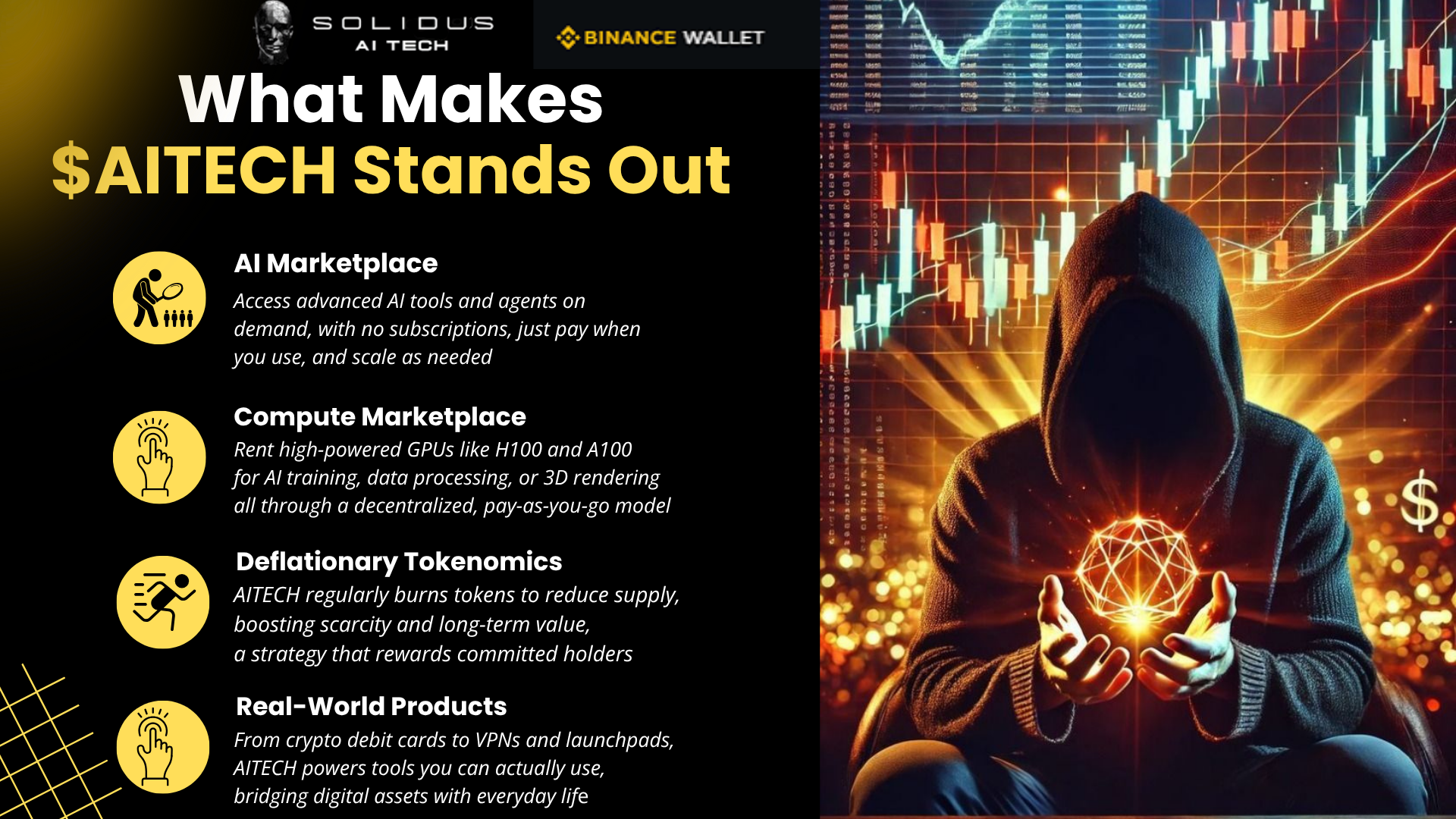 Полезность, заложенная в инфраструктуру Solidus, от AI-агентов до аренды GPU, предоставляет реальные случаи использования, которые могут поддерживать устойчивый спрос на AITECH.