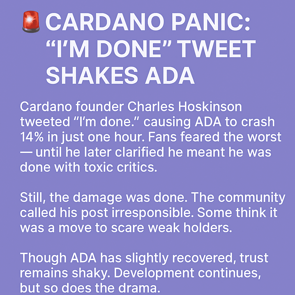Основатель Cardano Чарльз Хоскинсон твитнул «Я закончил», что вызвало падение ADA на 14% всего за час. Фанаты испугались худшего — пока он не уточнил, что имел в виду, что закончил с токсичными критиками.