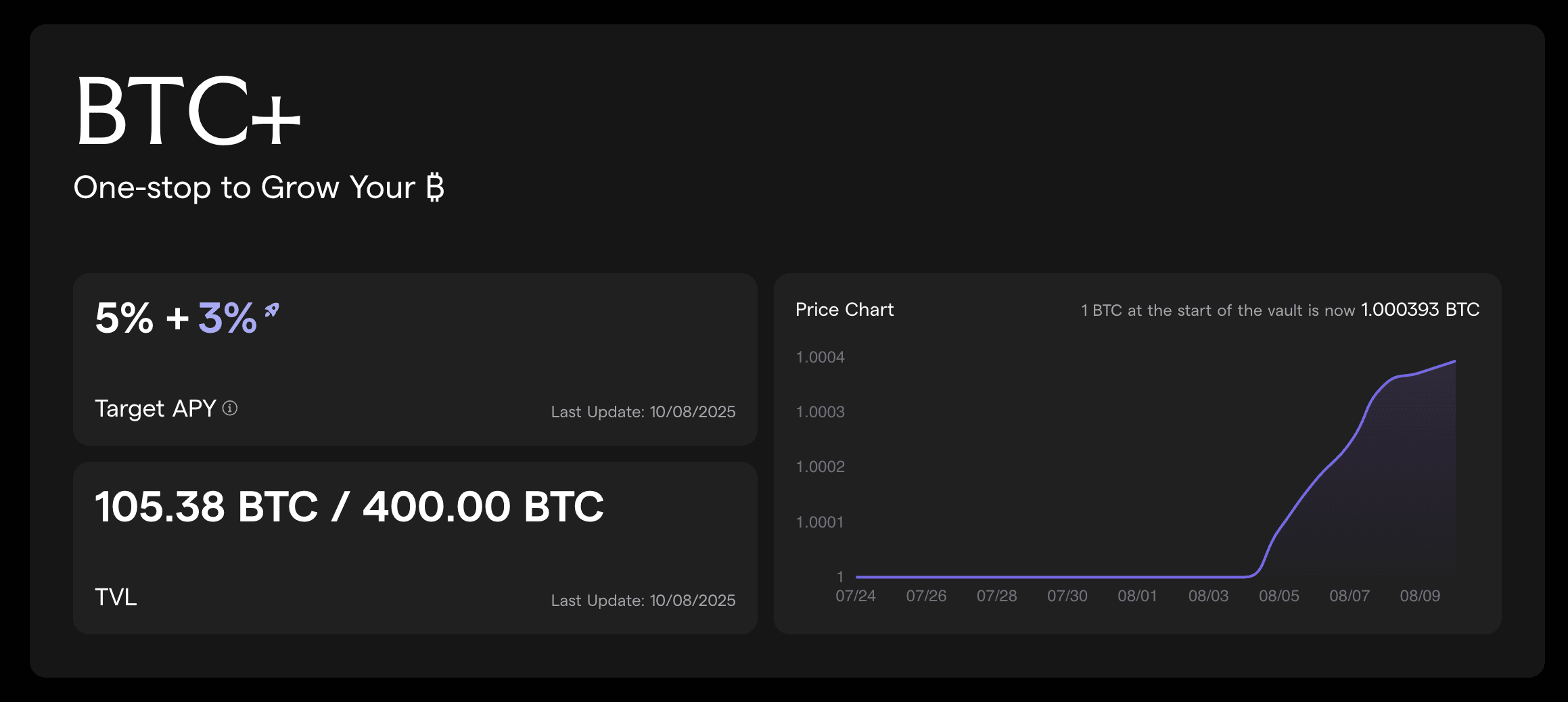 BTC+ предлагает базовую доходность 5–6% на Биткойн через бесшовный опыт хранилища с одним кликом. Никакого обертывания, никакого мостирования — пользователи могут ставить BTC напрямую в dApp Solv (ссылка) и мгновенно получить доступ к движку доходности, работающему на основе: