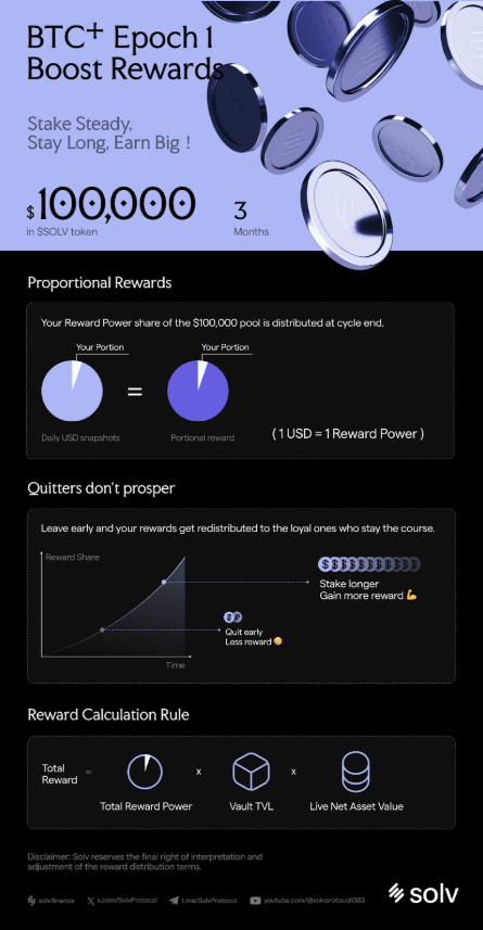 Кроме того, участники хранилища BTC+ делят пул вознаграждений в $100,000, распределяемый через систему вознаграждений на основе времени — чем дольше вы блокируете, тем больше ваша доля.