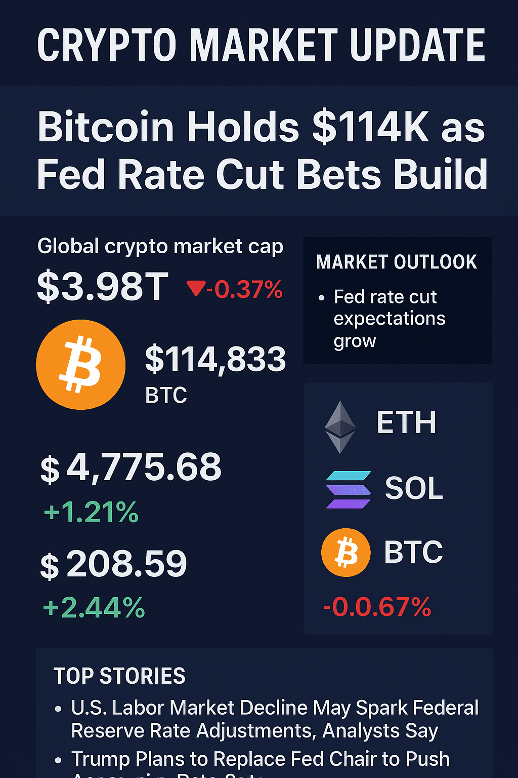 Мировая капитализация криптовалюты немного снизилась до $3.98 триллиона, что является снижением на 0.37% за последние 24 часа, согласно данным CoinMarketCap. Рыночные настроения остаются осторожными, поскольку трейдеры переваривают свежие данные по рынку труда США и нарастающие спекуляции о потенциальных снижениях ставок Федеральной резервной системы.